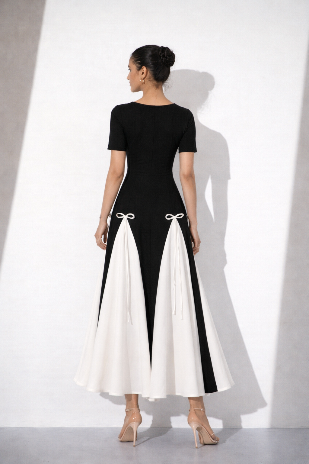 This handcrafted dress blends contemporary elegance with artistic contrast, featuring a sleek black heavy crepe bodice paired with flowing white crepe panels that create dramatic movement and visual depth. The minimalist round neckline and fitted short sleeves offer a clean, modern silhouette, while the statement tie-up detailing at the waist adds a soft feminine touch and highlights the figure beautifully.
