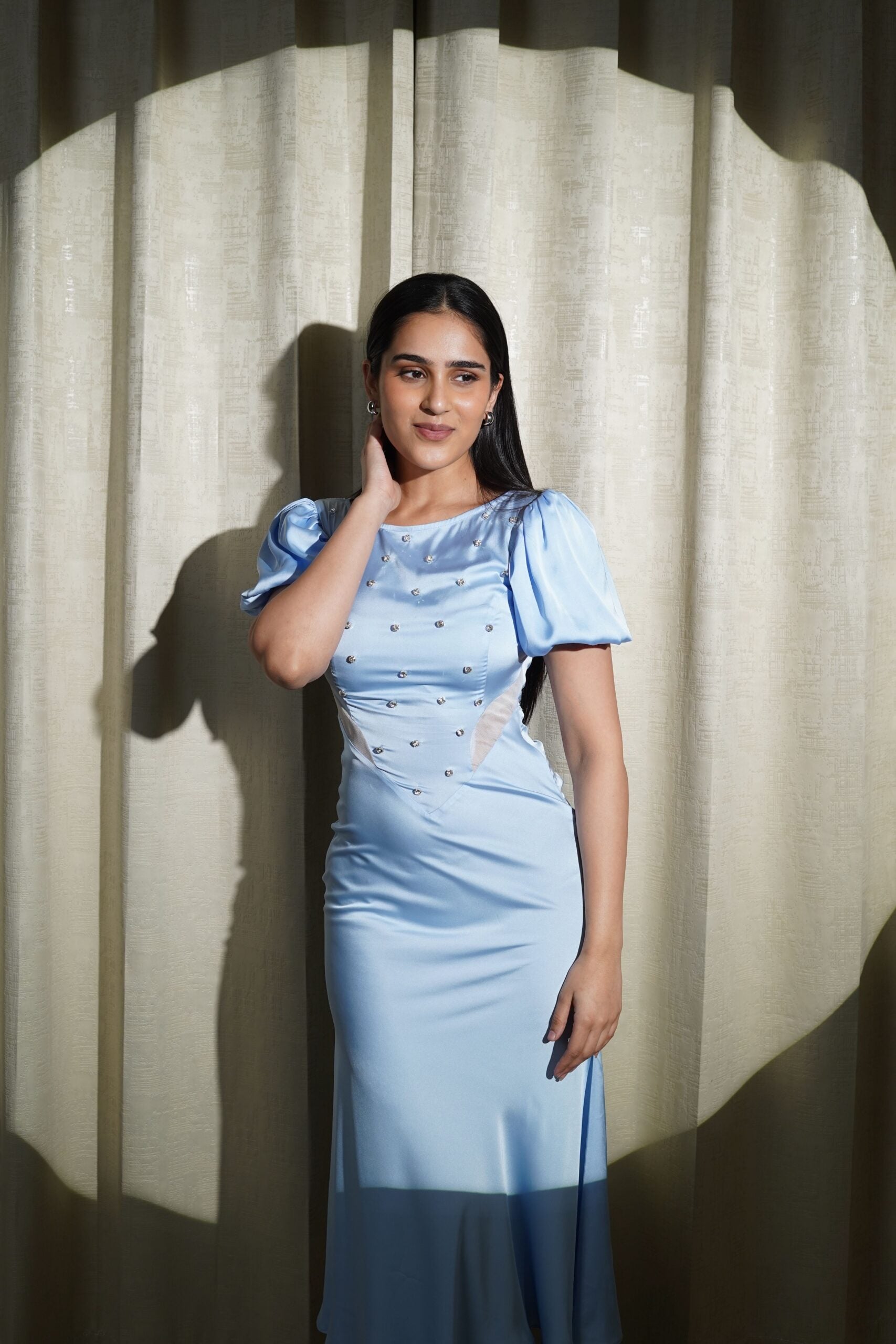 This enchanting blue satin dress is meticulously handcrafted to radiate elegance and charm. The fitted top is adorned with hand-stitched rhinestones, adding a touch of sparkle and luxury. It features short puffed princess sleeves, exuding a fairytale-like appeal, and cutout side detailing lined with delicate white net for a unique and playful touch. The ankle-length bottom flows gracefully with a rounded hem, offering a sophisticated silhouette. A concealed back zipper ensures a seamless and polished finish, making this dress perfect for special occasions or evening events where you want to shine.
