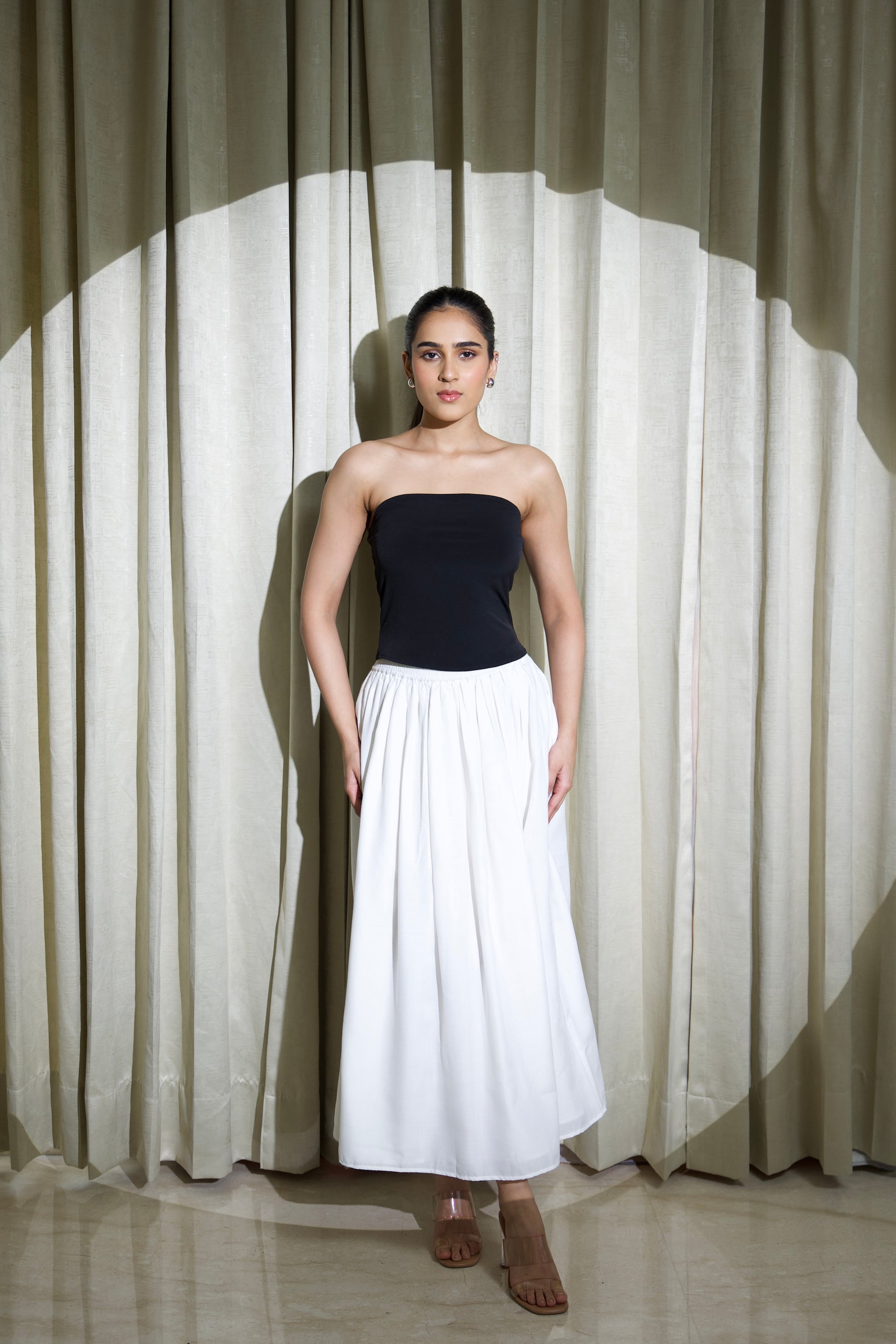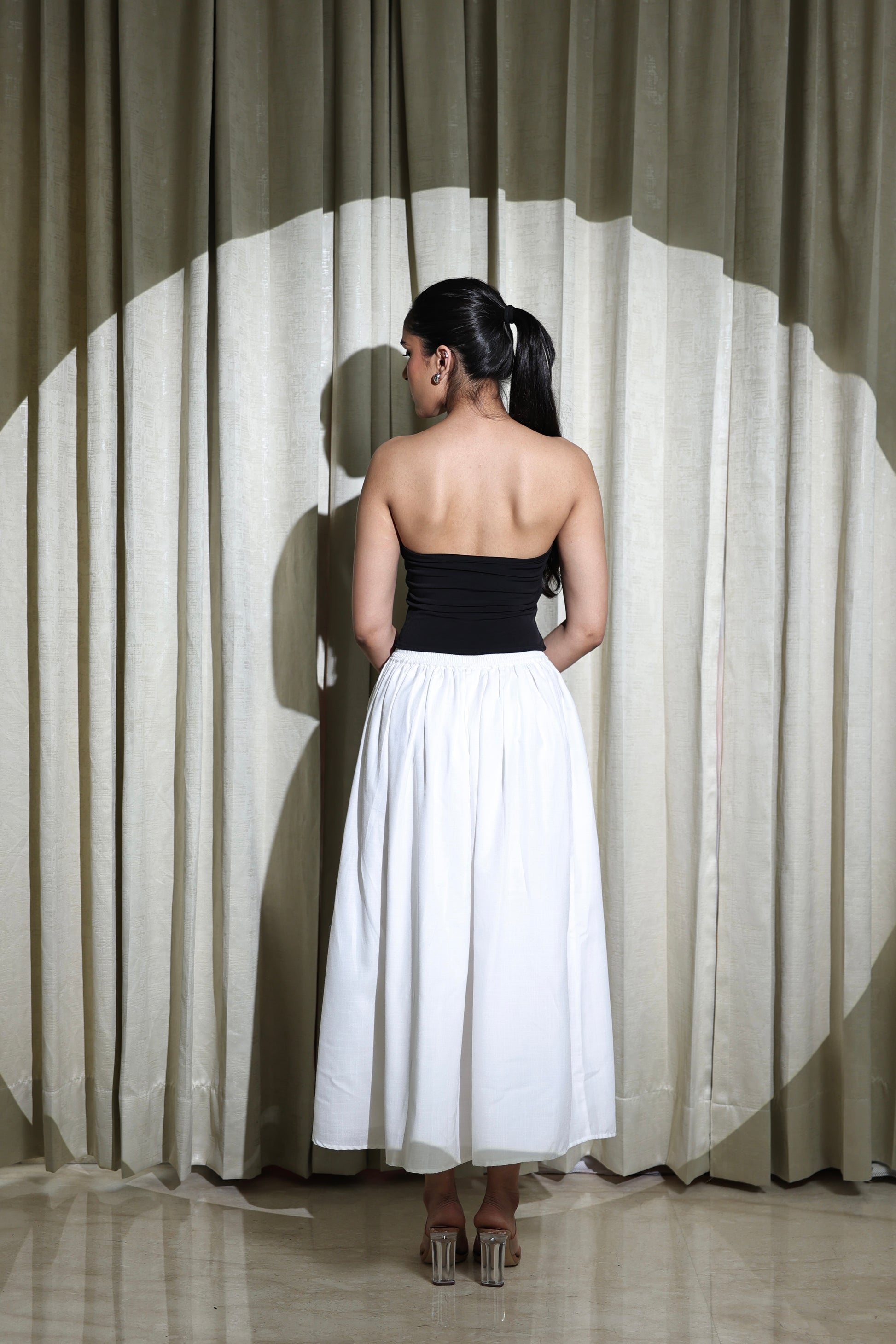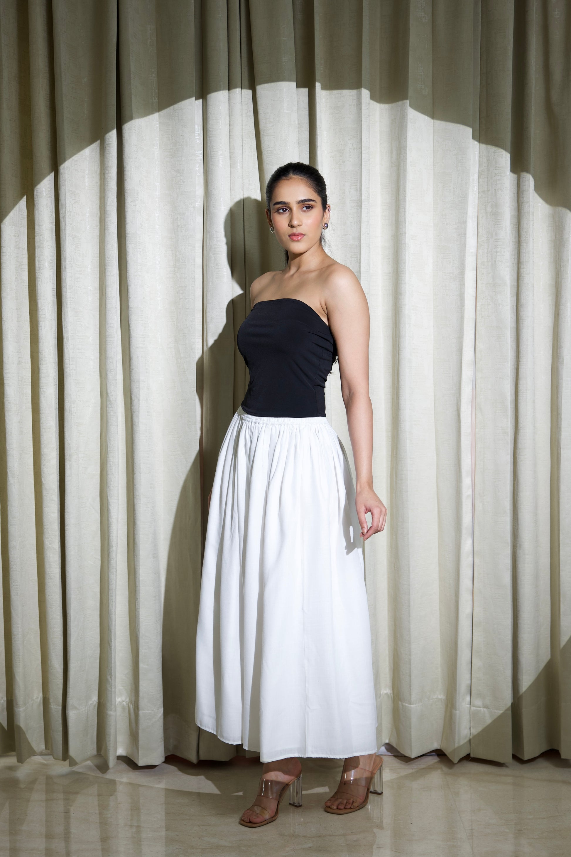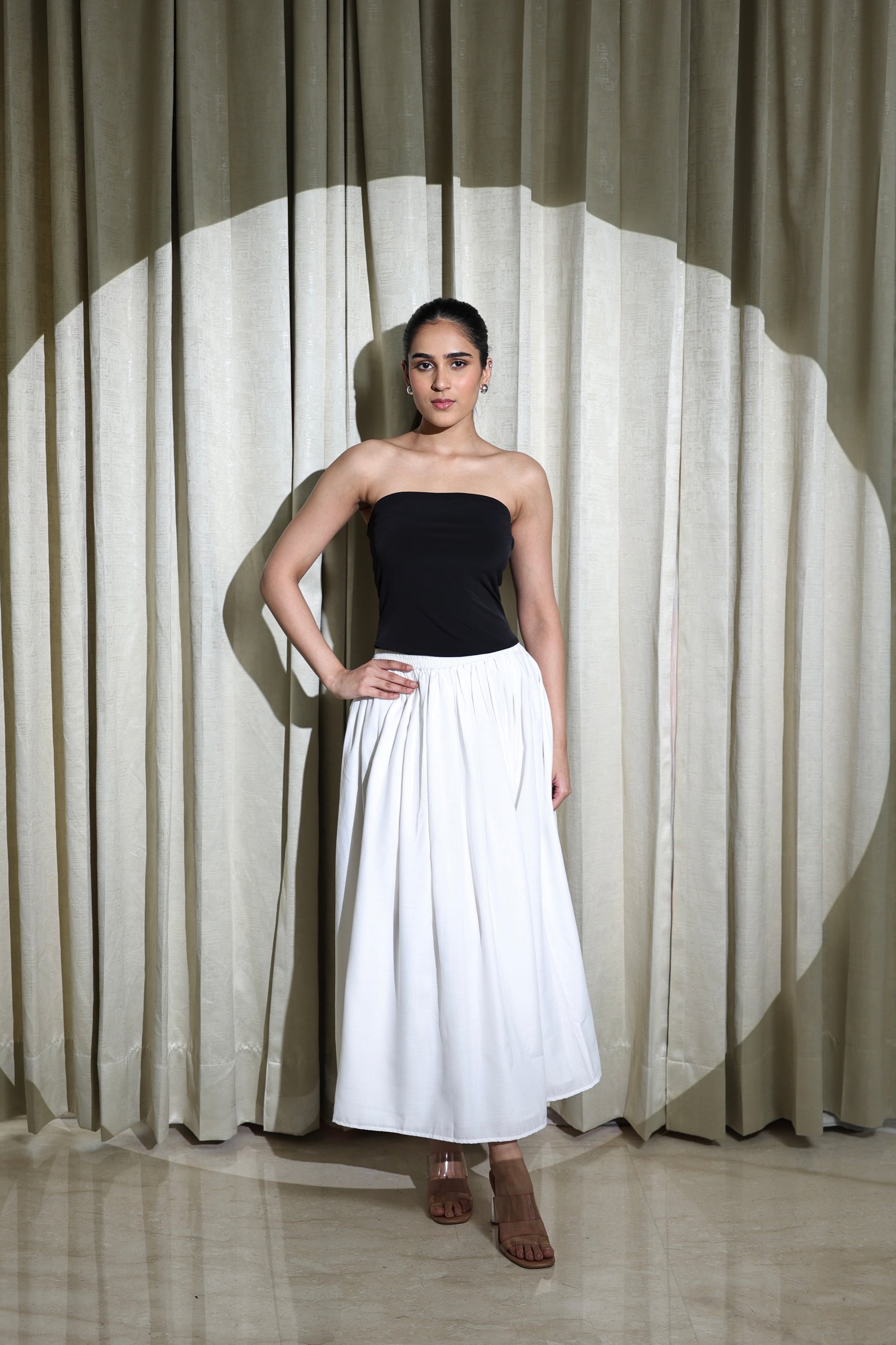This effortlessly chic set blends everyday comfort with a clean, minimal aesthetic. The black lycra top is designed for a smooth, body-enhancing fit, offering stretch, structure, and a sleek finish that sits beautifully against the skin. Paired with it is a pure white cotton skirt that adds freshness and ease to the look. The skirt features a soft elastic waistband for a comfortable, flexible fit and includes a gentle inner lining that provides coverage without adding bulk. Falling naturally with a relaxed, feminine drape, this set is perfect for warm days, casual outings, or laid-back evening plans.