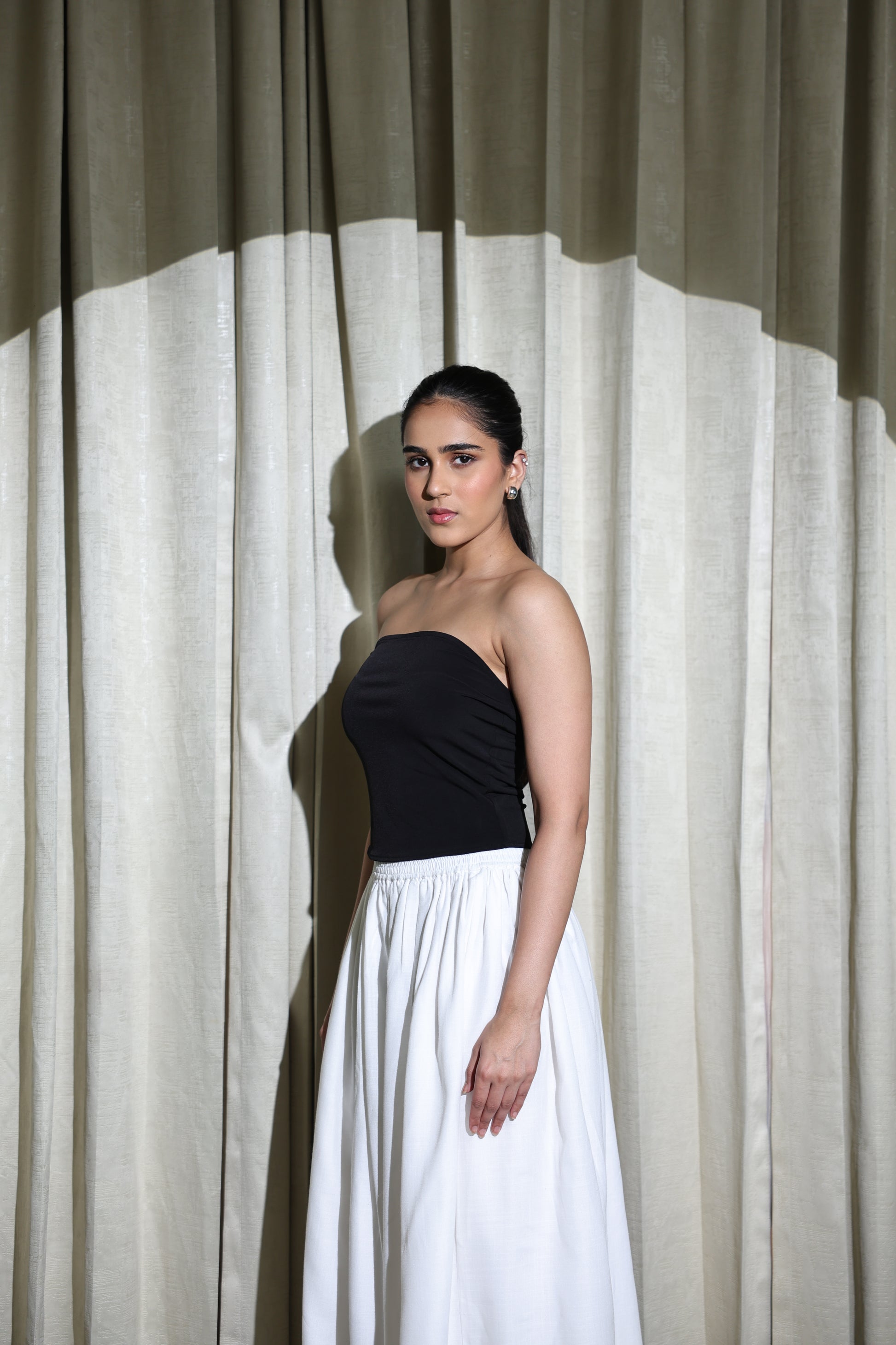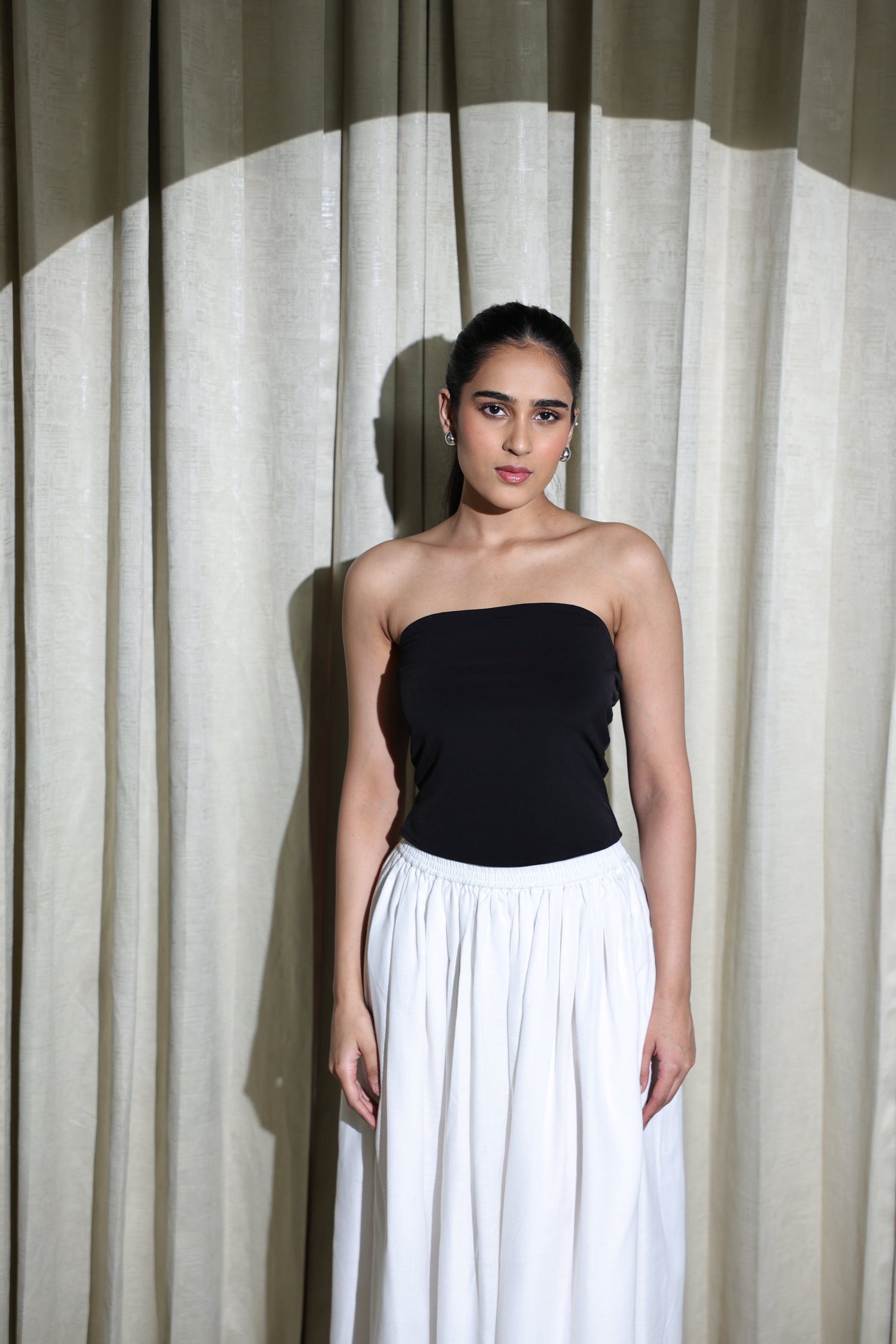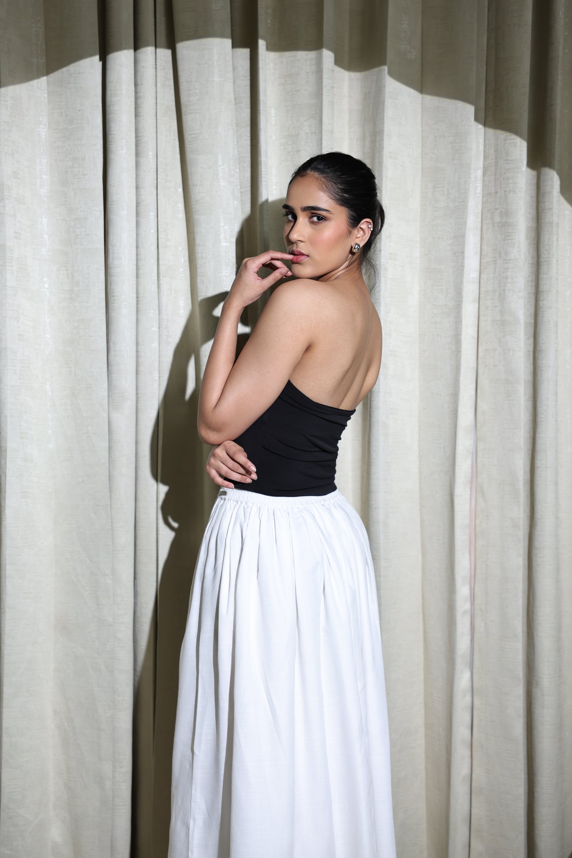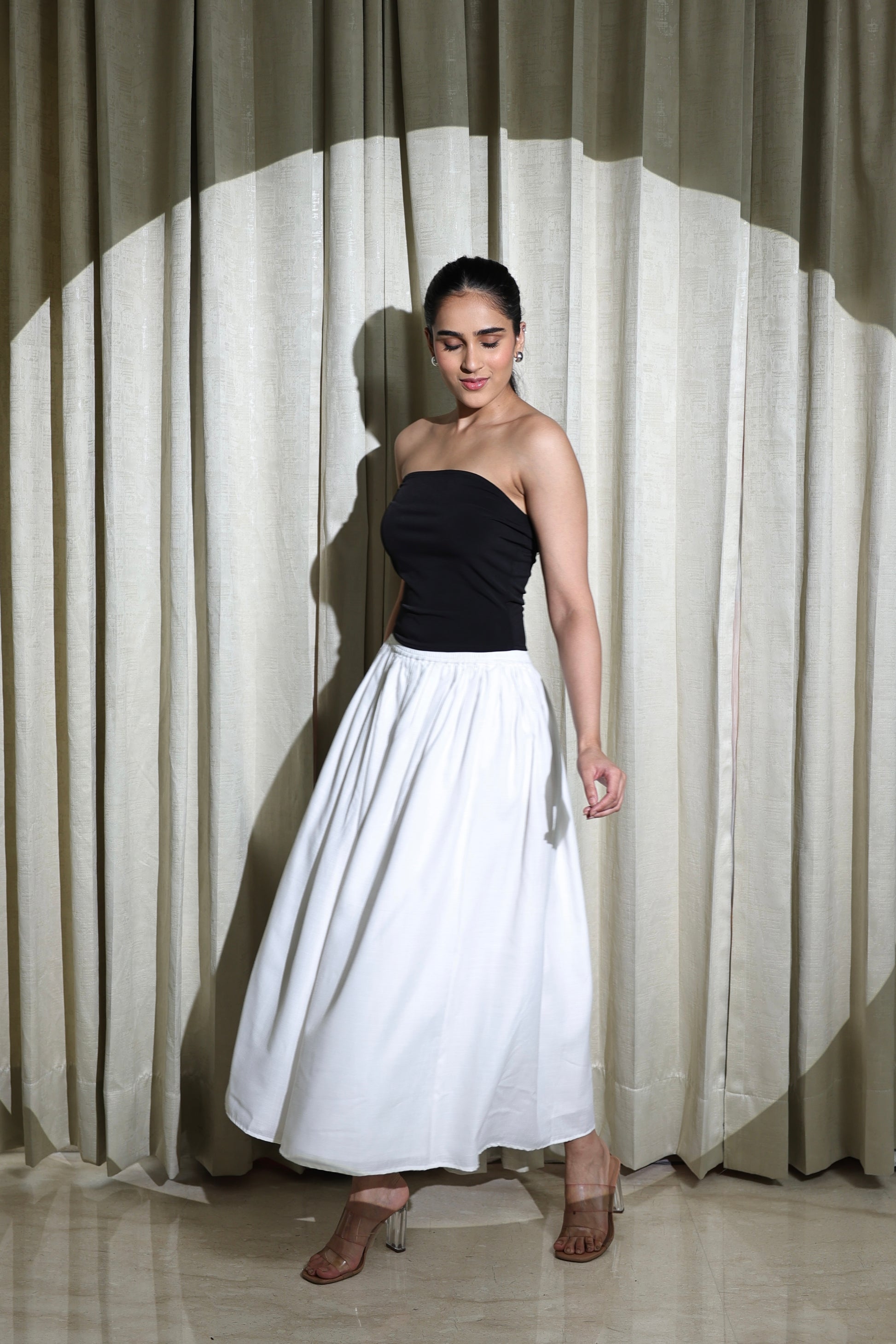 This effortlessly chic set blends everyday comfort with a clean, minimal aesthetic. The black lycra top is designed for a smooth, body-enhancing fit, offering stretch, structure, and a sleek finish that sits beautifully against the skin. Paired with it is a pure white cotton skirt that adds freshness and ease to the look. The skirt features a soft elastic waistband for a comfortable, flexible fit and includes a gentle inner lining that provides coverage without adding bulk. Falling naturally with a relaxed, feminine drape, this set is perfect for warm days, casual outings, or laid-back evening plans.