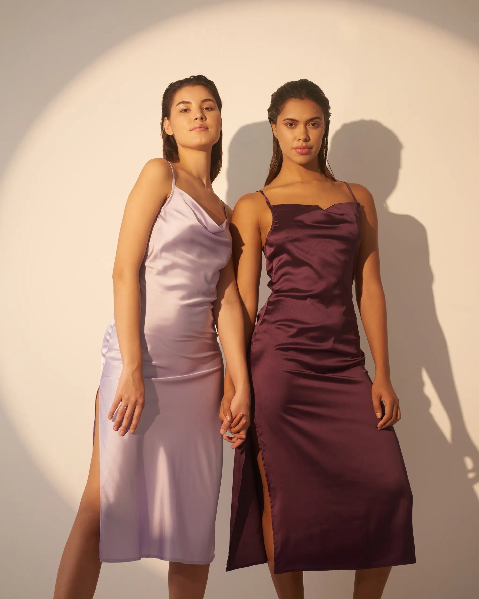 UNSTOPPABLE - Violet satin cowl neck slip dress