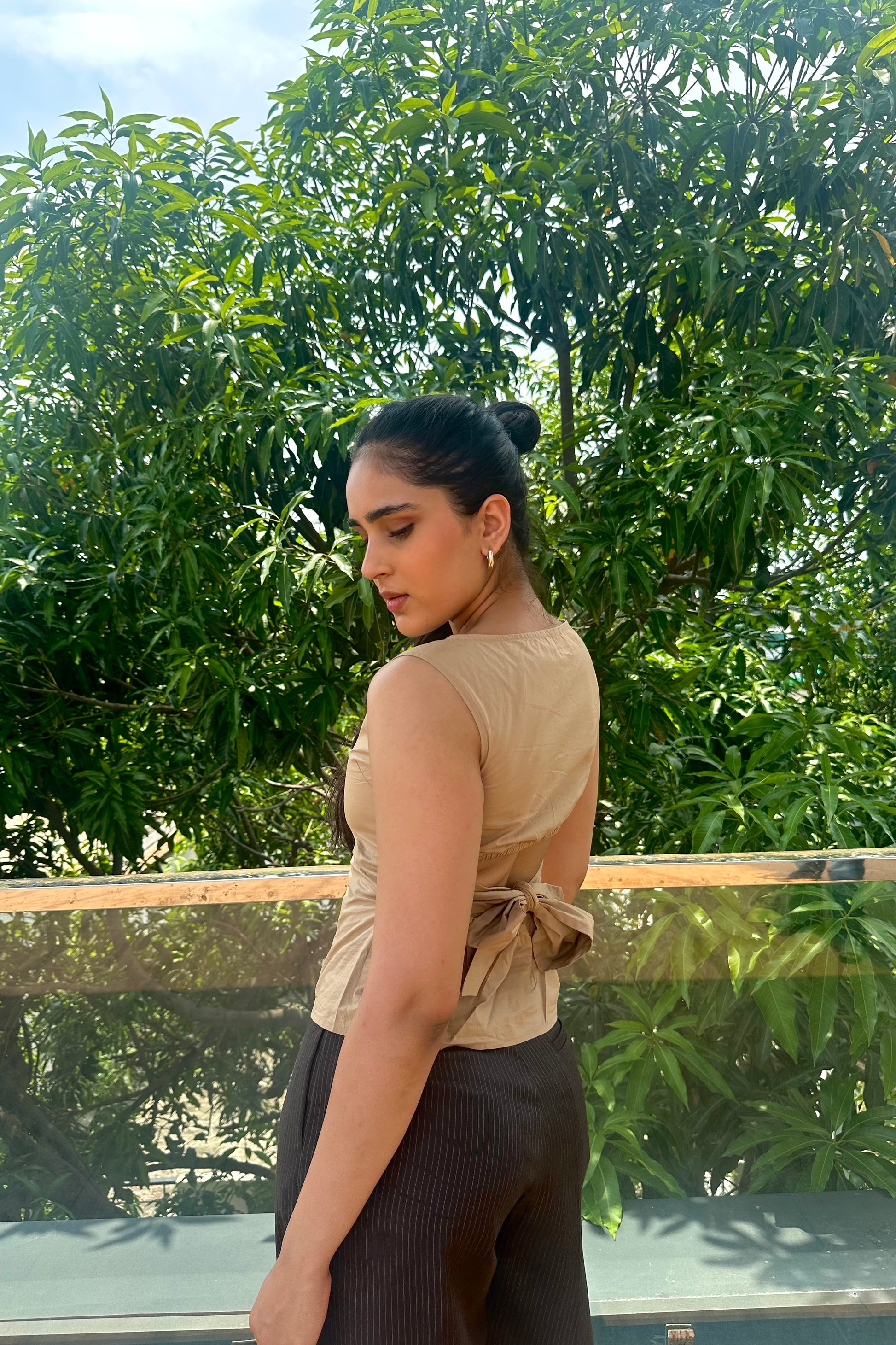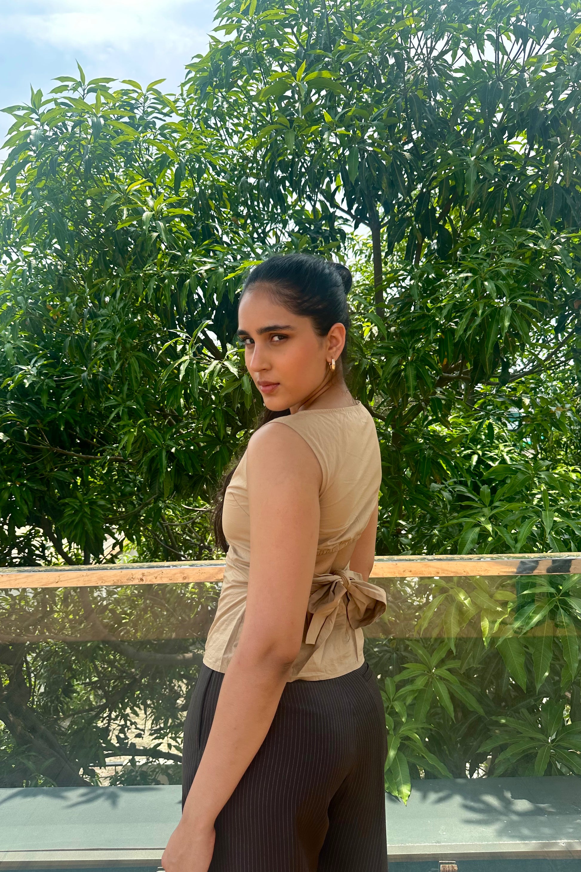 Introducing our Urban Ease Ensemble — a minimalist set designed for modern sophistication. The sleeveless beige top features a sleek high neckline and subtle seam detailing that gently contours the waist for a flattering silhouette. Paired with relaxed-fit charcoal pinstripe trousers, this look combines tailored polish with laid-back comfort. Soft pleats add movement and ease, making it perfect for warm days when you want to stay cool yet put-together. Complete the outfit with simple slides or strappy sandals for a contemporary, refined vibe.
