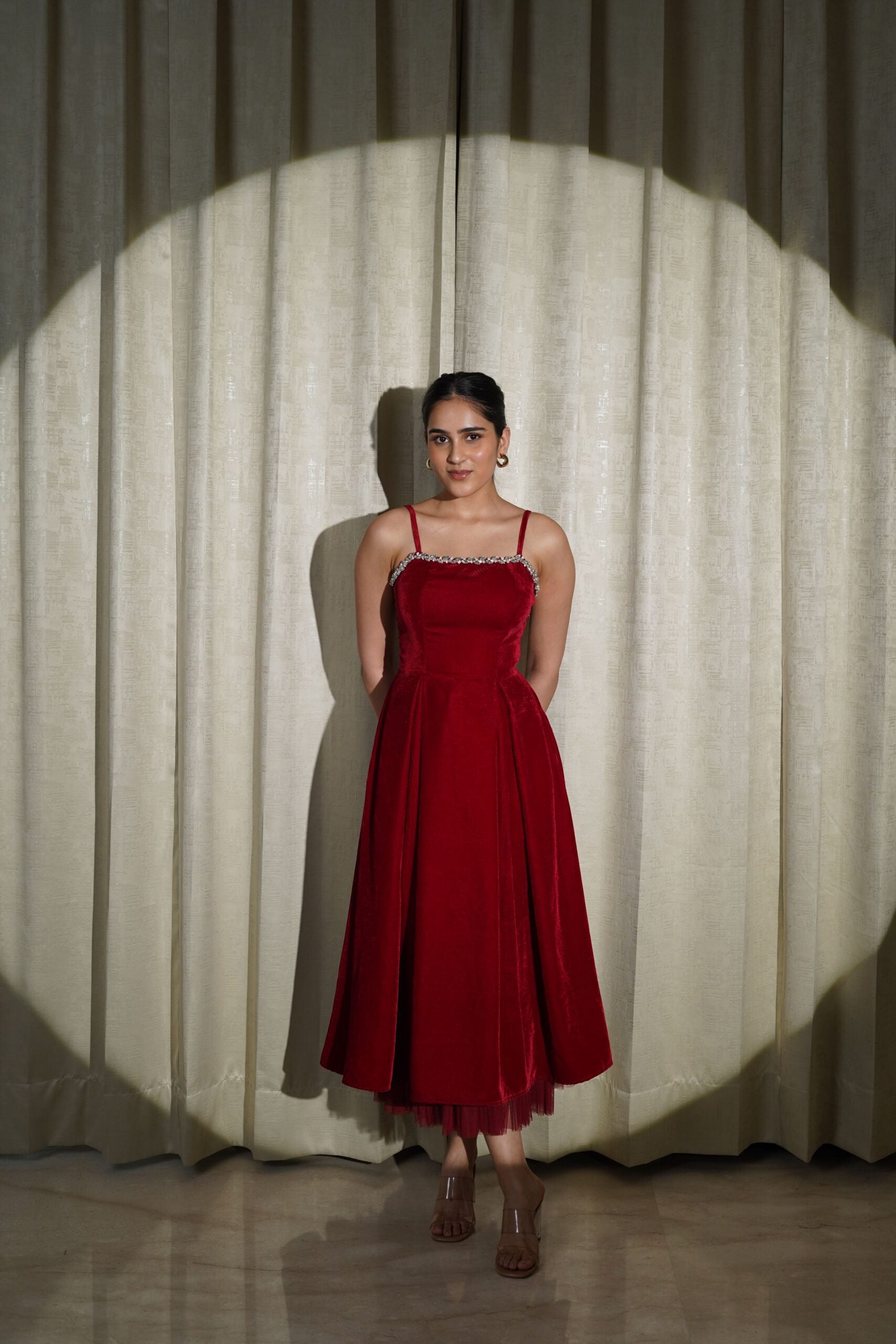 This handcrafted maroon velvet dress is a luxurious blend of elegance and versatility. The fitted bodice is adorned with hand-stitched rhinestone lace in the front, adding a sparkling touch of sophistication. It features adjustable straps, a self-tie back for a customizable fit, and a concealed side zipper for a seamless finish. The skater-style flared bottom falls gracefully to a calf-length, creating a flattering and feminine silhouette. The dress comes with a full-sleeve short cape, crafted to complement the design. The cape adds an extra layer of elegance and can be worn or removed for versatile styling, making this piece perfect for special occasions or glamorous evening events.
