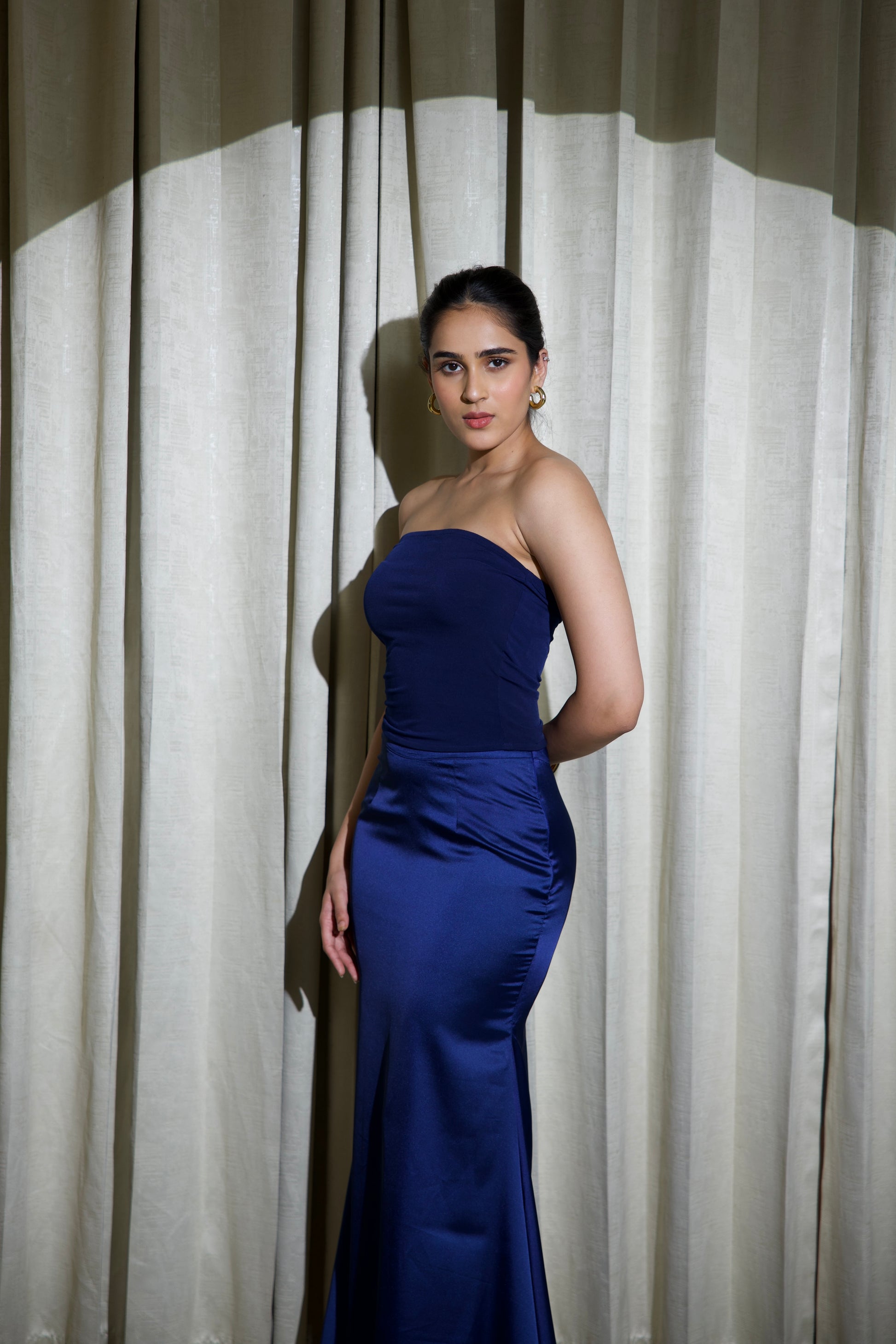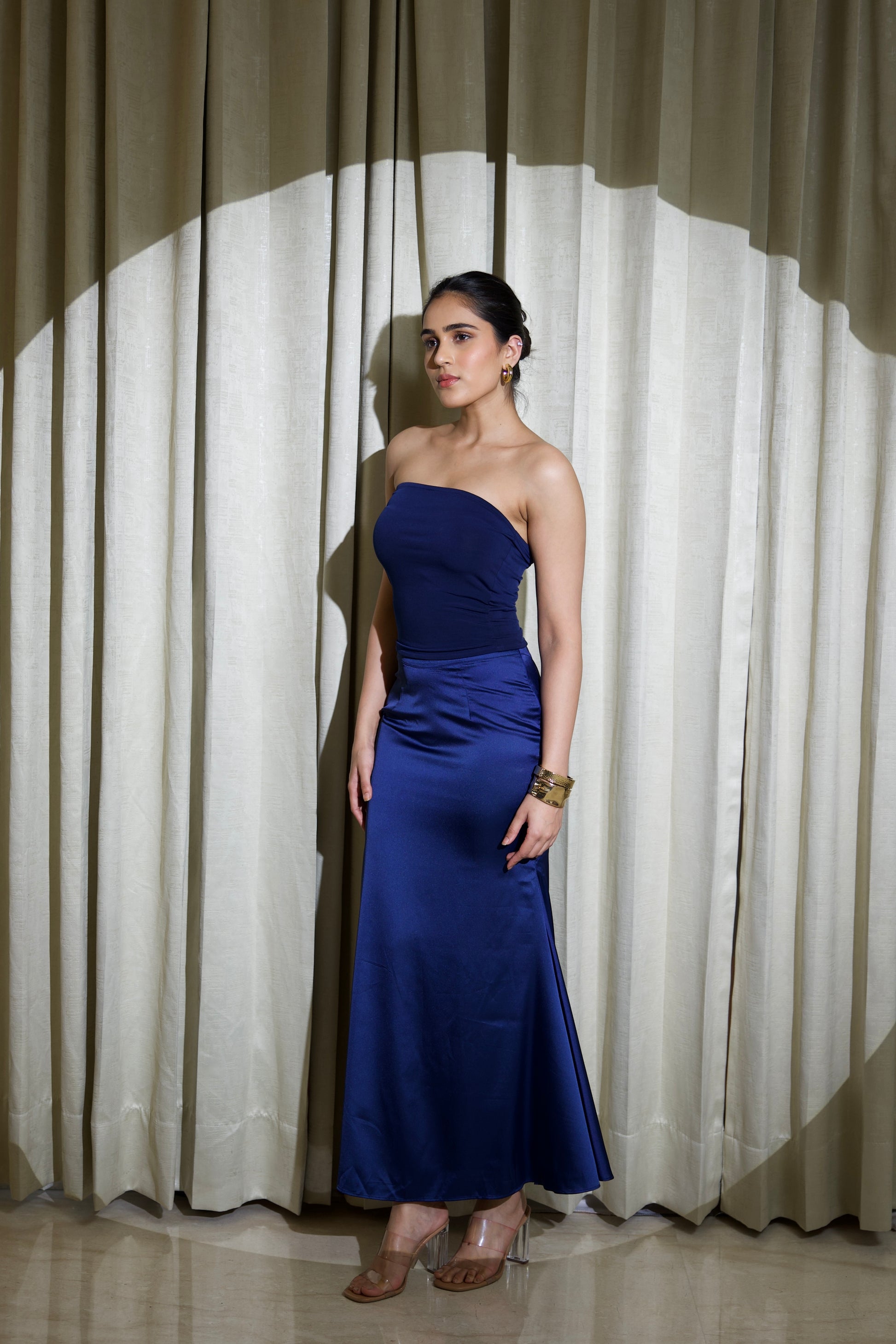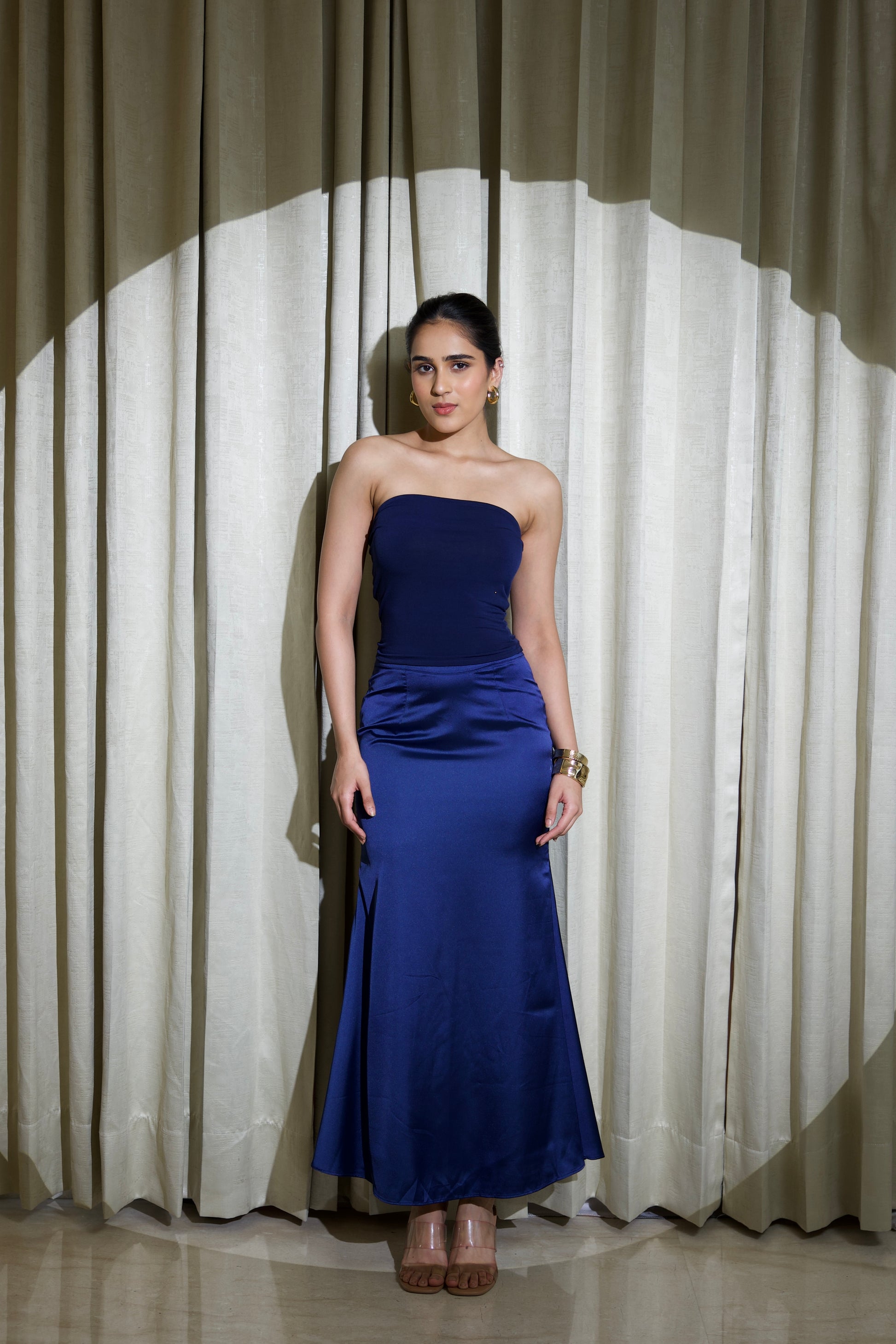 This elegant two-piece set pairs a sleek lycra tube top with a fluid satin skirt, creating a look that’s refined, modern, and effortlessly glamorous. The fitted lycra top offers a smooth, sculpted silhouette, sitting strapless across the neckline for a clean and minimal finish. Complementing it is a lustrous satin skirt that drapes beautifully, flaring softly towards the hem for graceful movement. The ensemble blends structure with flow, giving it a perfectly balanced, sophisticated appeal. A concealed side zipper on the skirt ensures a seamless, polished look. Ideal for evenings where simplicity meets luxury, this set is perfect for cocktail nights, dinners, and special celebrations.
