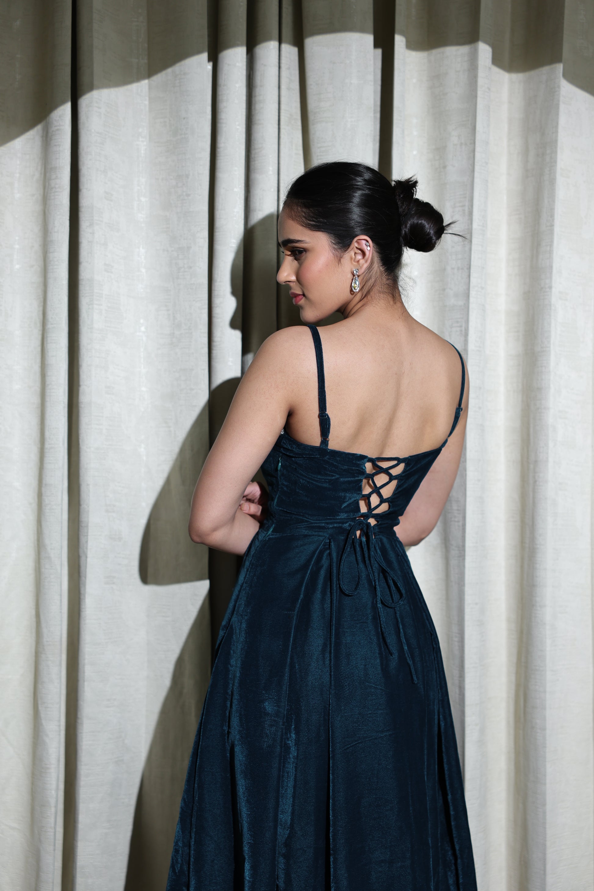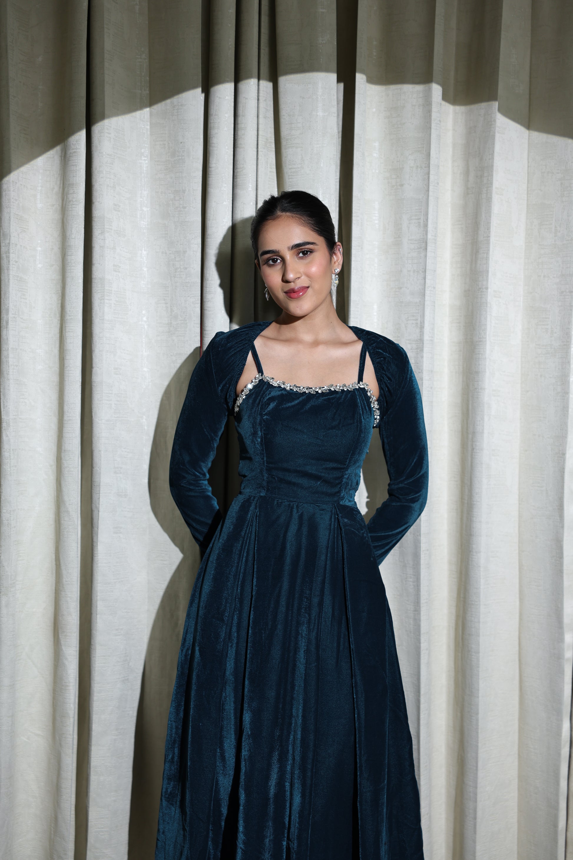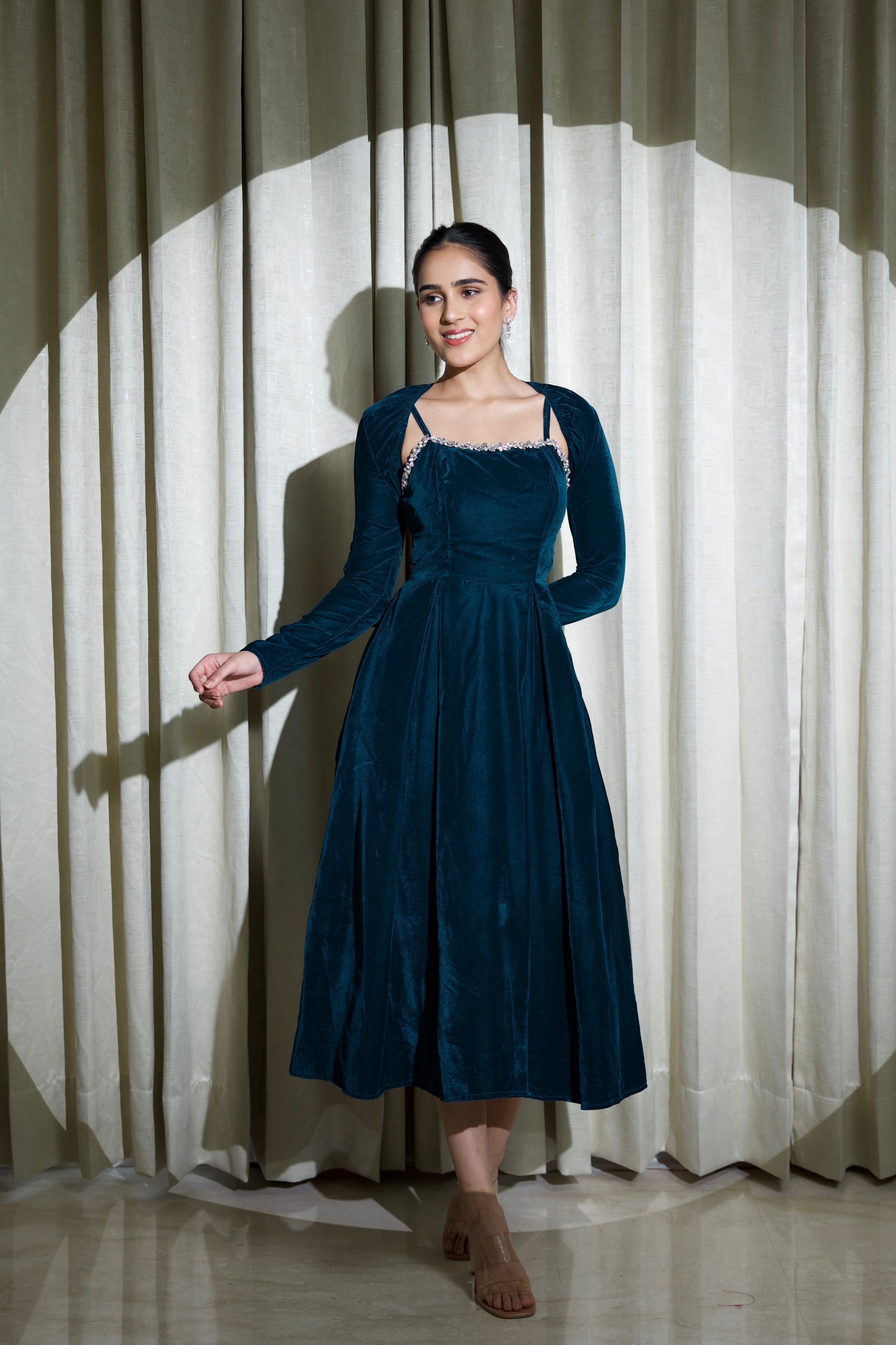 This handcrafted teal velvet dress is a luxurious blend of elegance and versatility. The fitted bodice is adorned with hand-stitched rhinestone lace in the front, adding a sparkling touch of sophistication. It features adjustable straps, a self-tie back for a customisable fit, and a concealed side zipper for a seamless finish. The skater-style flared bottom falls gracefully to a calf-length, creating a flattering and feminine silhouette. The dress comes with a full-sleeve short cape, crafted to complement the design. The cape adds an extra layer of elegance and can be worn or removed for versatile styling, making this piece perfect for special occasions or glamorous evening events.