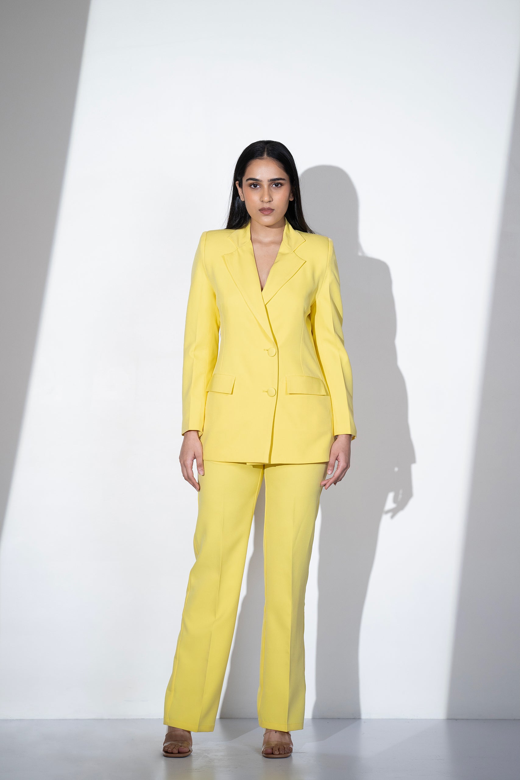 This vibrant pantsuit, handcrafted with heavy crepe fabric in a striking yellow hue, effortlessly blends boldness with sophistication. Featuring a double-breasted blazer and straight-cut pants, the ensemble combines modern tailoring with timeless elegance. The blazer is fully lined with luxurious satin for a refined finish and is designed with classic notch lapels, a double-breasted front adorned with same-fabric buttons, and flap welt pockets for practicality and style. The straight-cut pants are tailored to perfection with a high-rise waist that flatters the silhouette, functional side pockets, belt loops for versatility, and a premium same-color zipper for a polished appearance. Ideal for formal events, professional settings, or occasions where standout style is essential, this pantsuit is both striking and sophisticated.